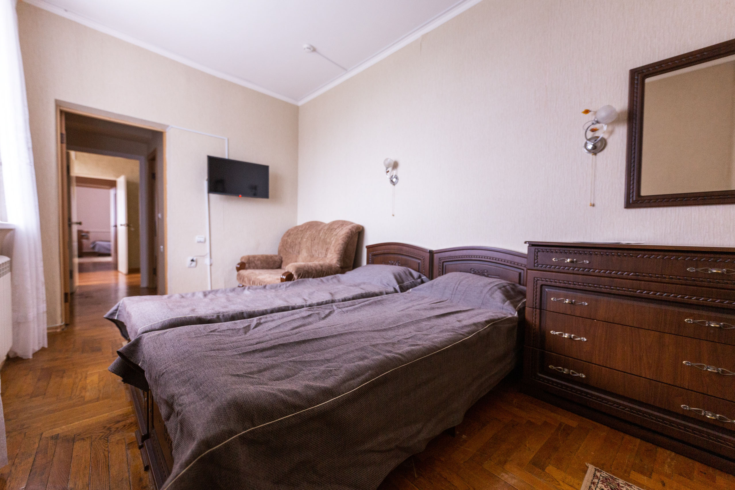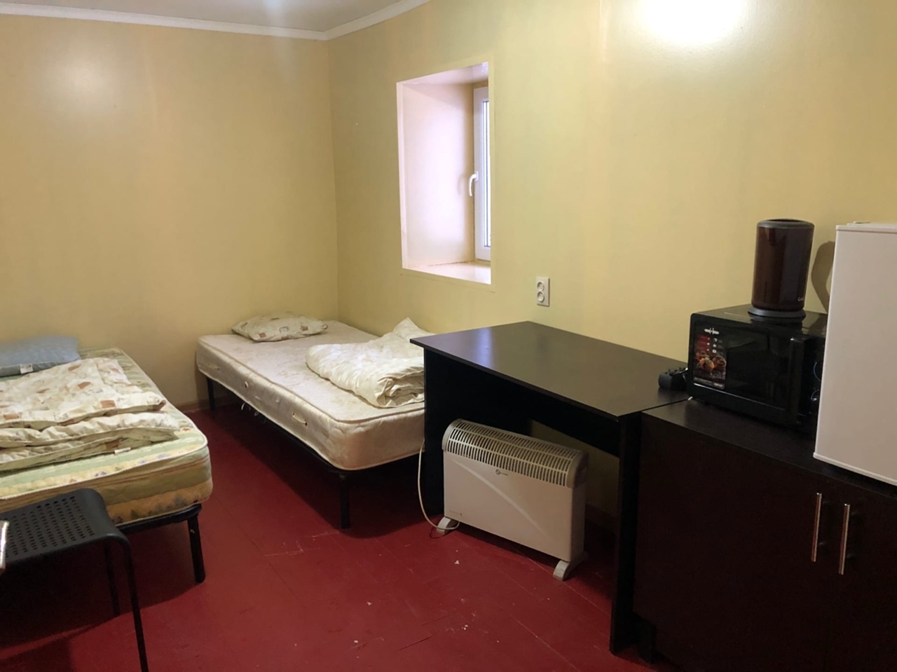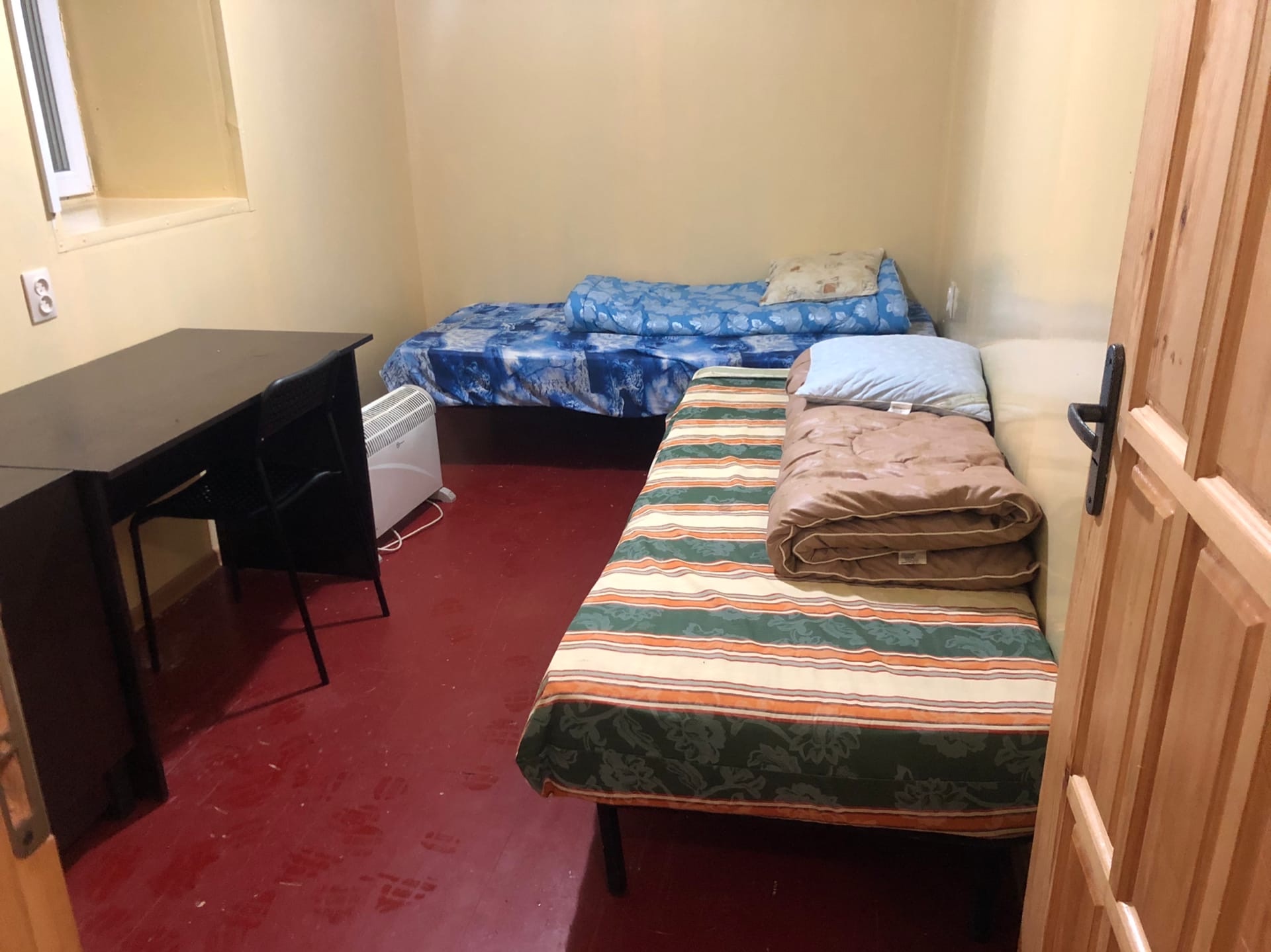 Две двухместные комнаты, общий душ и туалет, в комнатах есть холодильник, микроволновка и чайник. Кухня и гостиная — в соседнем здании ~10 м.