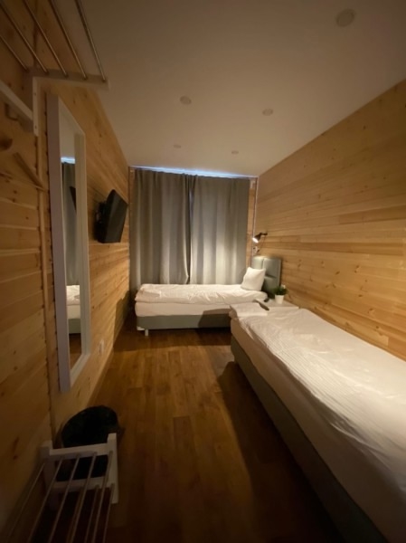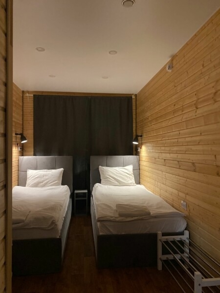 Проживание в комнатах типа «Комфорт»: двухместный номер с отдельными кроватями (можно соединить в одну большую), ортопедическими матрасами, ТВ, есть шкаф, обогреватель, шторы блэкаут. Удобства общие на этаже: туалет, душ, фен, полотенца.