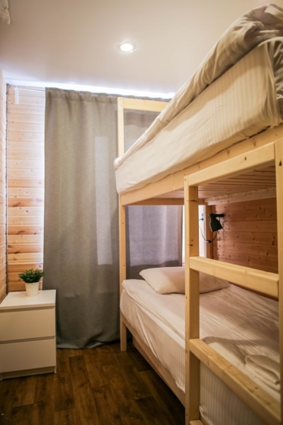 Проживание в комнатах типа «Бюджет»: двухместный номер с 2-х ярусной кроватью, ортопедическими матрасами, есть обогреватель, шторы блэкаут. Удобства общие на этаже: туалет, душ, фен, полотенца.
